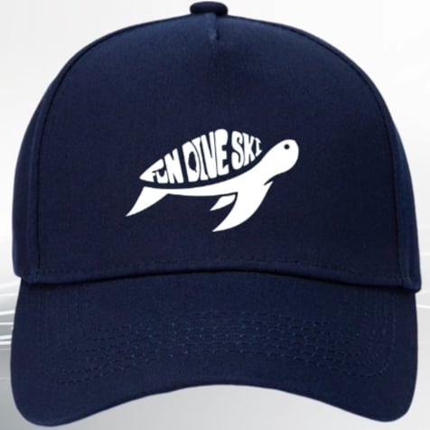The Fun Dive Ski baseball cap features the classic brand logo as the centerpiece, cleverly blending elements of skiing and diving: